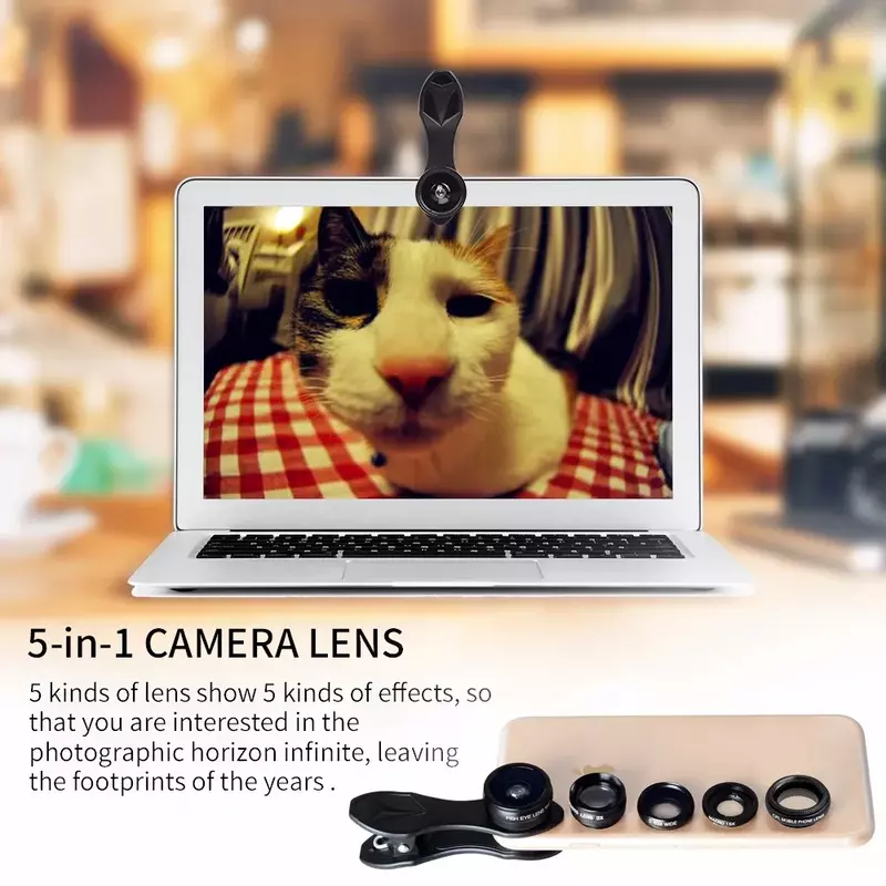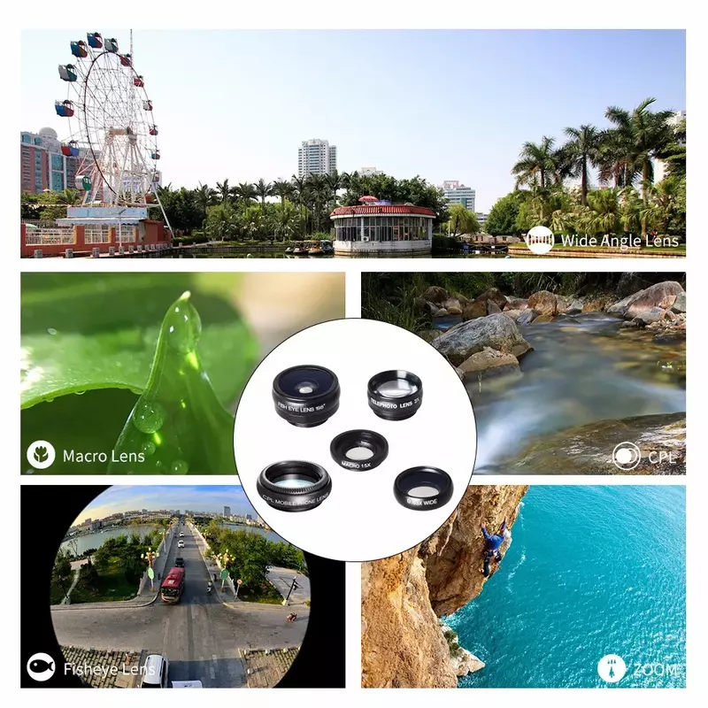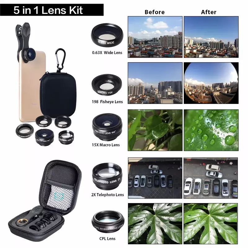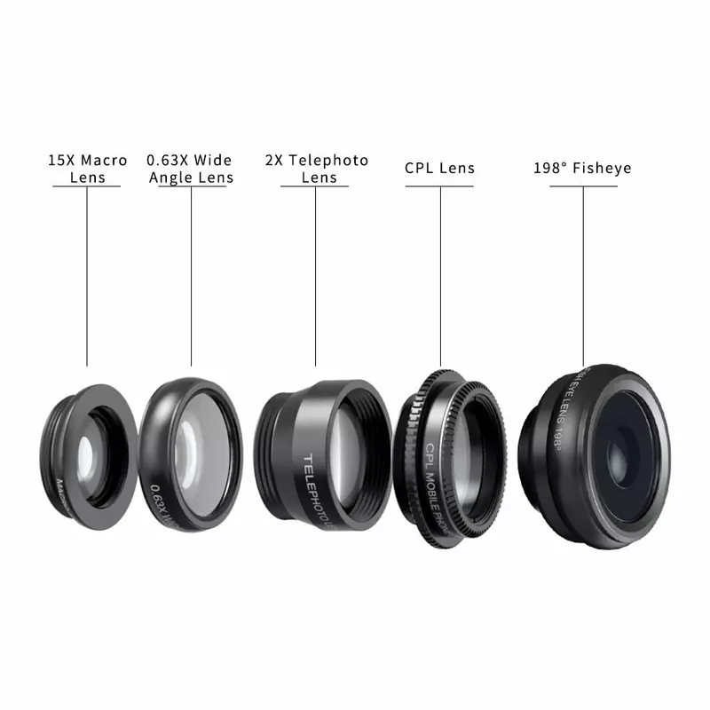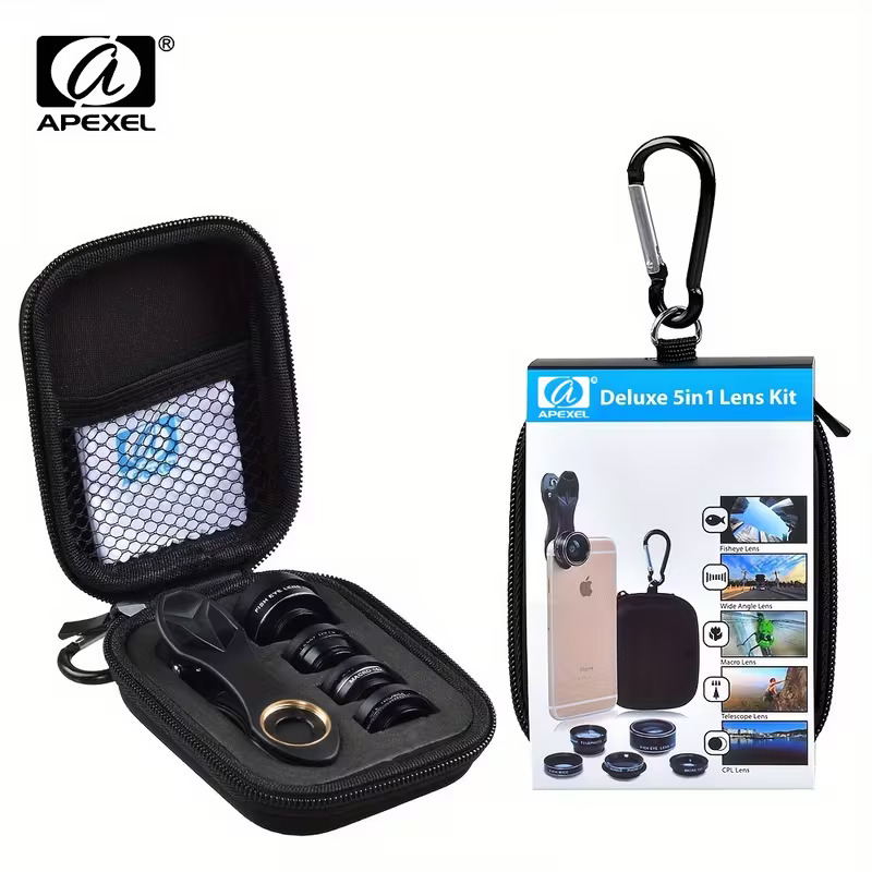 APEXEL 5-in-1 Multi-Lens Camera Kit is designed for mobile photography enthusiasts who need professional-grade photography tools for their smartphone. Featuring 5 diverse lenses (Fisheye, Macro, Wide Angle, Telephoto, CPL) and high-clarity glass, this model ensures stunning, versatile shots with ease. Upgrade your setup today with Azzaman Household.