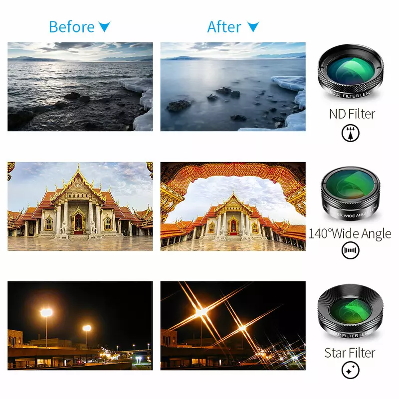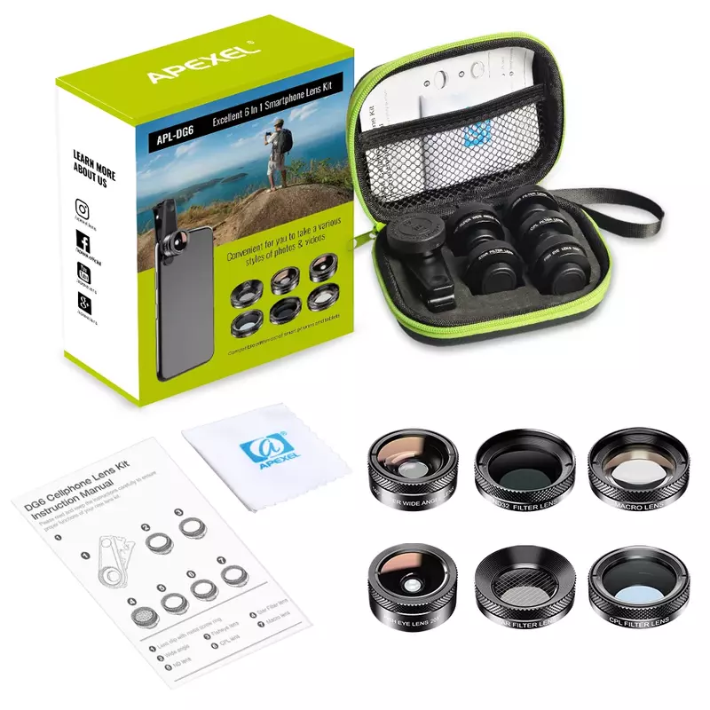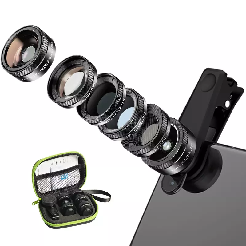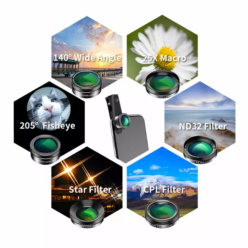 The Apexel 6-in-1 Lens Kit is your ultimate companion for elevating smartphone photography to new heights. This comprehensive set includes a 205° Fisheye Lens, 140° Wide Angle Lens, 25x Macro Lens, CPL Filter, 6-Point Star Filter, and an ND32 Filter, all designed for universal compatibility with most smartphones via a convenient clip-on mechanism. Whether you’re capturing expansive landscapes, intricate close-ups, or creative artistic effects, this kit empowers you to explore diverse photographic styles and achieve professional-quality results directly from your phone. Discover more Mobile Phone Accessories at Azzaman Household and unlock your creative potential.