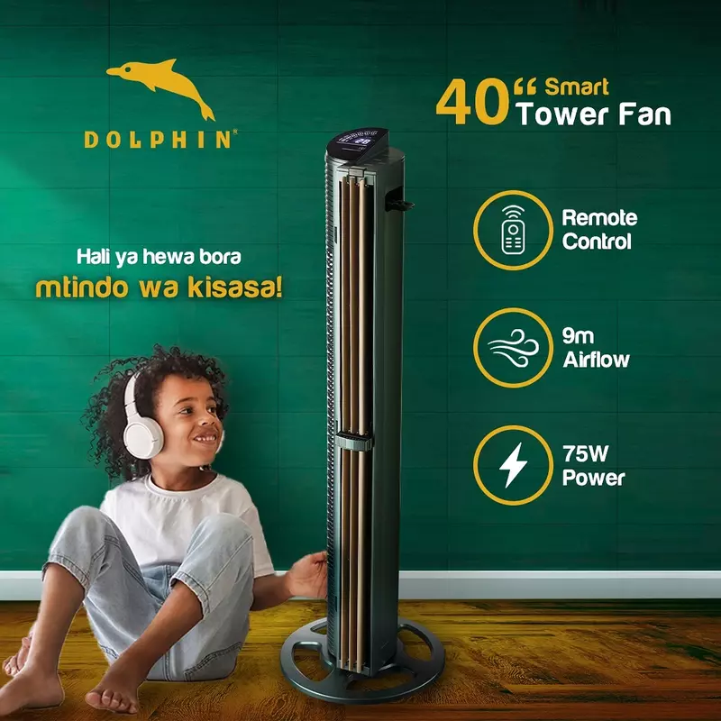 The Dolphin Smart Tower Fan 40” 75W is designed for discerning individuals and families who need intelligent, customizable, and effective cooling for their living spaces. Featuring an intuitive LED Touch Screen and a convenient Remote Control, alongside 3 versatile Fan Modes and 6 precise Speed Levels, this model ensures optimal comfort and convenience with stronger airflow. Upgrade your setup today with Azzaman Household.