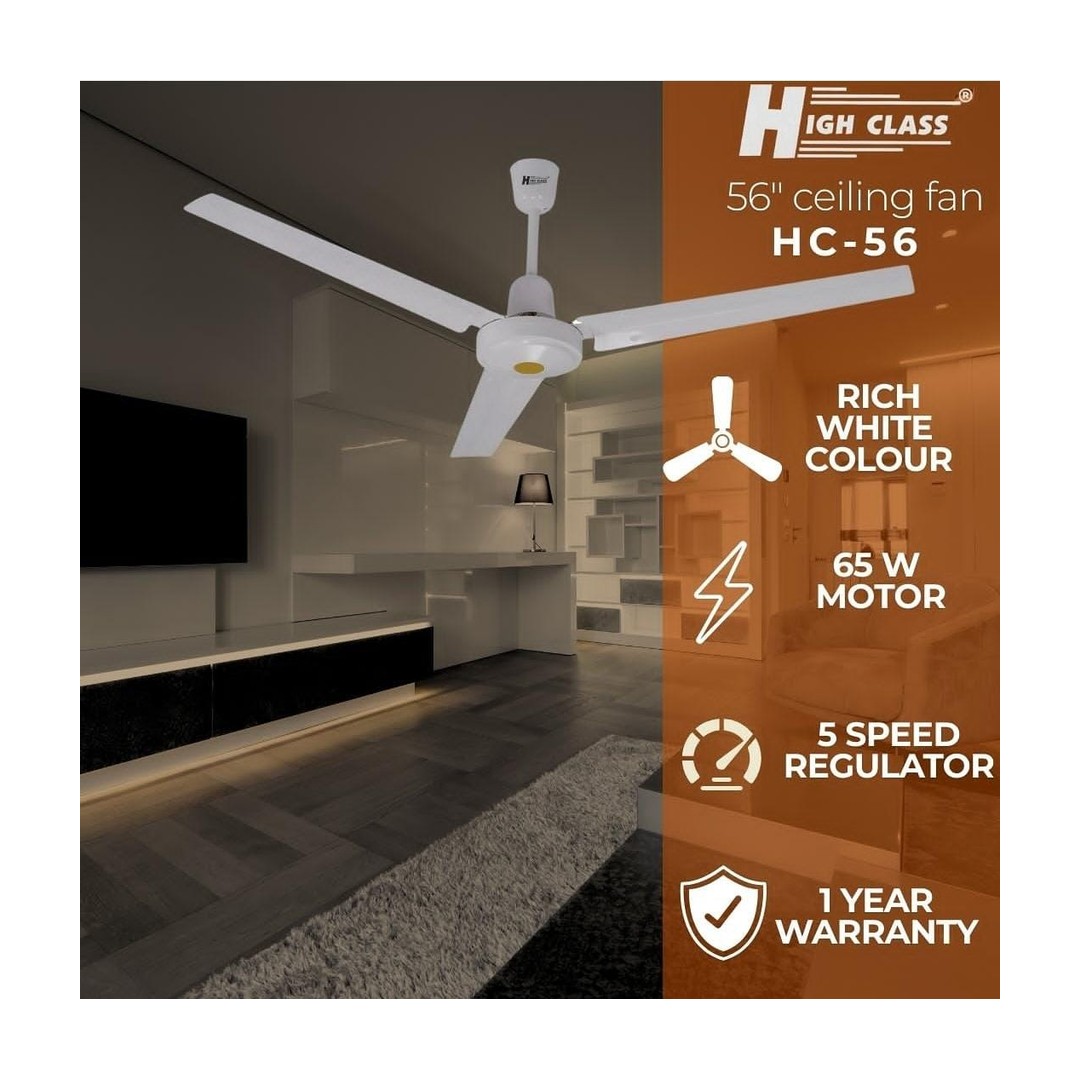 Elevate your living or working space with the High Class 56″ Ceiling Fan (Model: HC-56, SKU: N78670). Engineered for optimal comfort and energy savings, this fan blends powerful performance with elegant design. Its robust 65W motor delivers exceptional airflow across a wide 56-inch span, ensuring your rooms remain cool and inviting, while its energy-efficient design helps reduce your utility bills. Whether you’re furnishing a new home, upgrading an office, or looking for reliable air circulation in commercial spaces, this fan is an ideal choice, available at Azzaman Household and discover more essential items in our Uncategorized product section.