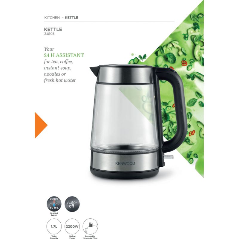 Elevate your kitchen experience with the Kenwood 1.7L Glass Jug Kettle ZJG08.000CL, a powerful and elegant addition designed for modern living. Boasting a robust 2200W heating element, this kettle ensures you can boil up to 1.7 litres of water in just 3-4 minutes, perfect for making hot cereals, instant coffee, tea, or even quickly preparing water for cooking pasta, saving you precious time, especially during busy mornings. Its transparent, heat-resistant glass body offers a captivating visual delight as water heats up, providing a clear view of the boiling process. Equipped with essential safety features like automatic shut-off once water boils and boil-dry protection to prevent operation when empty, the Kenwood Jug Kettle guarantees peace of mind and energy efficiency. The 360-degree cordless swivel base allows for effortless pouring and convenient placement from any angle, while the bright water level indicator and automatic lid opening further enhance user convenience. From the trusted Kenwood brand, this kettle blends innovative technology with sleek design, making it an indispensable tool for every kitchen.