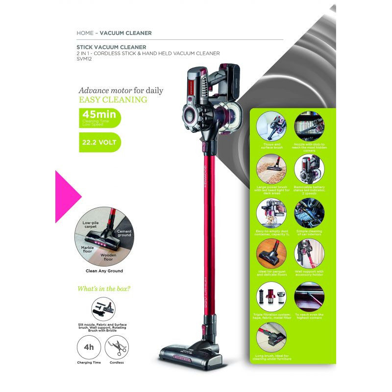 Experience the freedom of immaculate cleaning with the Kenwood 2-in-1 Cordless Stick Vacuum Cleaner. Engineered for modern living, this powerful 160W device combines the convenience of a cordless stick vacuum with the precision of a handheld cleaner, making it perfect for every surface and hard-to-reach area. With a robust 22.2V Li-ion battery, enjoy up to 45 minutes of consistent, fade-free suction, ensuring your home remains effortlessly pristine. Its lightweight design and intuitive controls make cleaning a breeze, transforming a chore into a seamless experience. Discover a new standard of clean with this versatile Vacuum Cleaner.