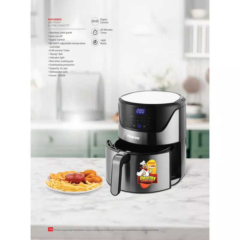 Nikai 6L Digital Airfryer NAF688DS is designed for health-conscious individuals and busy families who need effortless healthy cooking. Featuring 1800W power and 6L digital control, this model ensures perfectly cooked, guilt-free meals with ease. Upgrade your setup today with Azzaman Household.
