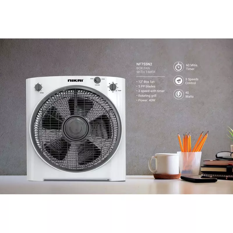 Nikai 12-Inch Rotating Grill Box Fan is designed for anyone seeking efficient and quiet cooling. Featuring a 12-inch rotating grill and a 60-minute timer, this model ensures optimal comfort and convenience in any room. Upgrade your setup today with Azzaman Household.