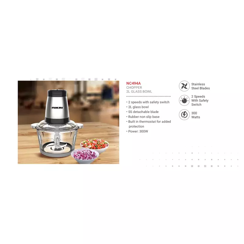Experience culinary convenience like never before with the Nikai NC494A Chopper, exclusively available at Azzaman Household. Engineered for efficiency, this 300W powerhouse makes light work of your chopping tasks, transforming ingredients with remarkable speed and precision. Its robust motor and durable stainless steel blades, paired with a generous 2-liter glass bowl, ensure consistent results, whether you’re dicing vegetables, mincing herbs, or preparing baby food. Designed for everyday use, it combines powerful performance with intuitive operation, making meal prep a joy.