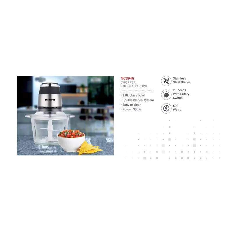 Nikai Chopper 3L Glass Bowl 500W NC394G is designed for home cooks and busy individuals who need efficient and versatile food preparation. Featuring a generous 3L glass bowl and a powerful 500W motor, this model ensures fast, consistent, and safe chopping. Upgrade your setup today with Azzaman Household.