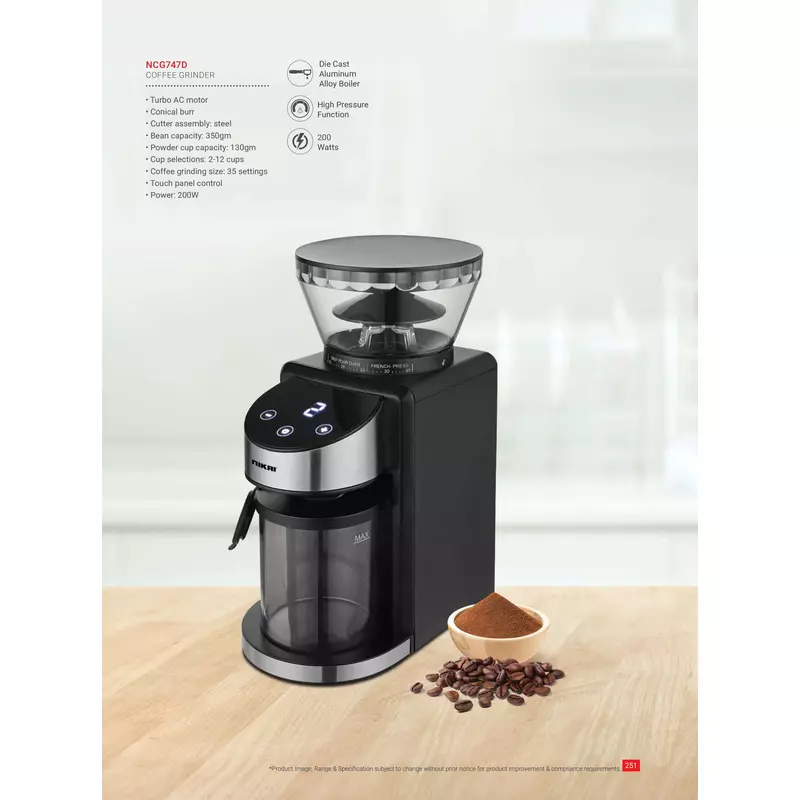 Nikai Conical Burr Coffee Grinder NCG747D is designed for coffee enthusiasts and home baristas who need consistent, fresh grounds for superior flavor. Featuring a precision conical burr and intuitive touch panel control with 35 settings, this model ensures a perfect grind for every brewing method. Upgrade your setup today with Azzaman Household.