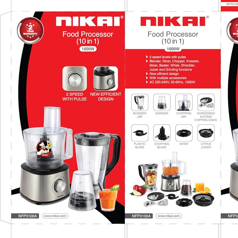 Nikai Food Processor 1.6L 10 In 1 1000W NFP3100A is designed for busy home cooks and culinary enthusiasts who need unparalleled versatility and efficiency in the kitchen. Featuring a powerful 1000W motor and 10-in-1 functionality, this model ensures effortless meal preparation and professional results. Upgrade your setup today with Azzaman Household.