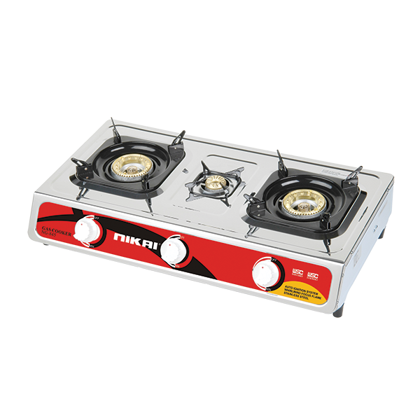 Nikai 3 Burner Gas Cooker NG845 is designed for busy home cooks and culinary enthusiasts who need efficient and versatile cooking. Featuring three powerful burners and an auto ignition system, this model ensures effortless meal preparation. Upgrade your setup today with Azzaman Household.