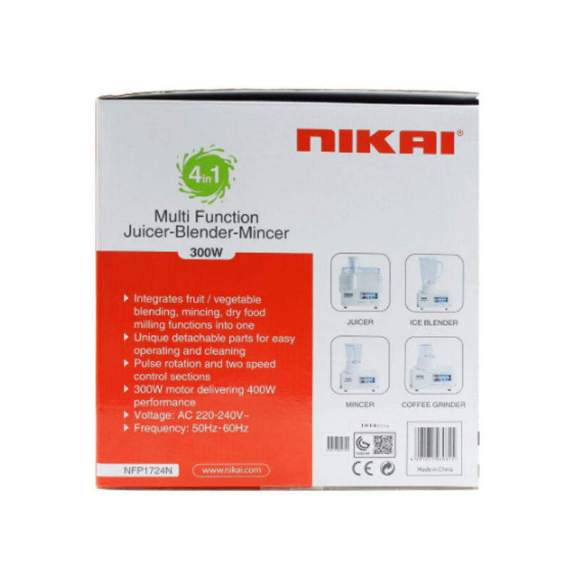 For anyone seeking to streamline their kitchen tasks and unleash their inner chef, the Nikai Juicer Extractor NFP1724N is the ultimate choice. Its robust 4-in-1 functionality, powerful 300W motor, and user-friendly features make it perfect for busy professionals, budding home cooks, or anyone who values efficiency and quality in their food preparation. Experience the convenience of a versatile appliance that can handle everything from fresh morning juices to elaborate dinner preparations. Get yours today at Azzaman Household and elevate your culinary game.