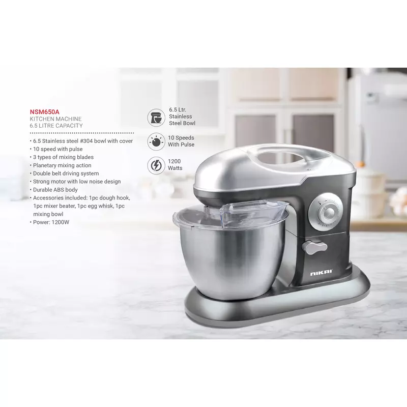 Nikai 6.5L Kitchen Machine is designed for passionate home chefs and busy families who need effortless food preparation and professional results. Featuring a powerful 1200W motor and a generous 6.5L stainless steel bowl, this model ensures consistent, perfectly mixed ingredients every time. Upgrade your setup today with Azzaman Household.