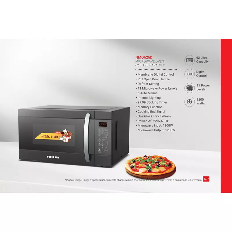 Experience culinary convenience like never before with the Nikai 62L Digital Microwave. Engineered for modern kitchens, this robust appliance combines a generous 62-liter capacity with intelligent digital control, putting a world of cooking possibilities at your fingertips. From quick reheating to elaborate defrosting and precise cooking, its powerful 1200W output ensures fast and even results, transforming your meal preparation into an effortless delight. The intuitive membrane digital control panel makes operation simple, while the sleek design complements any kitchen aesthetic. Discover a new standard of efficiency and performance for your daily cooking needs with this essential Microwave.