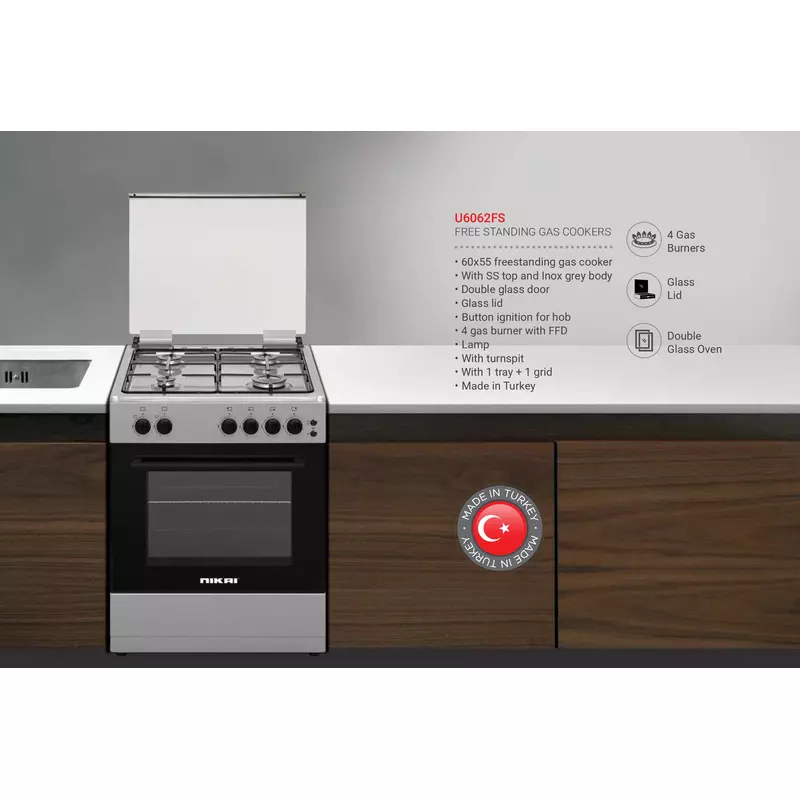 Elevate your kitchen experience with the Nikai Freestanding Cooking Range U6062FS, designed to blend seamless performance with a sleek aesthetic. Crafted with the finest materials, this 60x55cm gas cooker offers flawless operation, making it an indispensable appliance for every kitchen that values cooking with ease and efficiency. Whether you’re simmering, frying, baking, or grilling, this versatile range allows you to prepare multiple dishes simultaneously, thanks to its four robust gas burners and a spacious gas oven. The timeless stainless steel top and inox grey body ensure durability and a sophisticated look that complements any decor, while its Turkish craftsmanship speaks to its quality. Easily integrate this high-performance Cooking Range into your culinary space and rediscover the joy of faster, more enjoyable cooking.