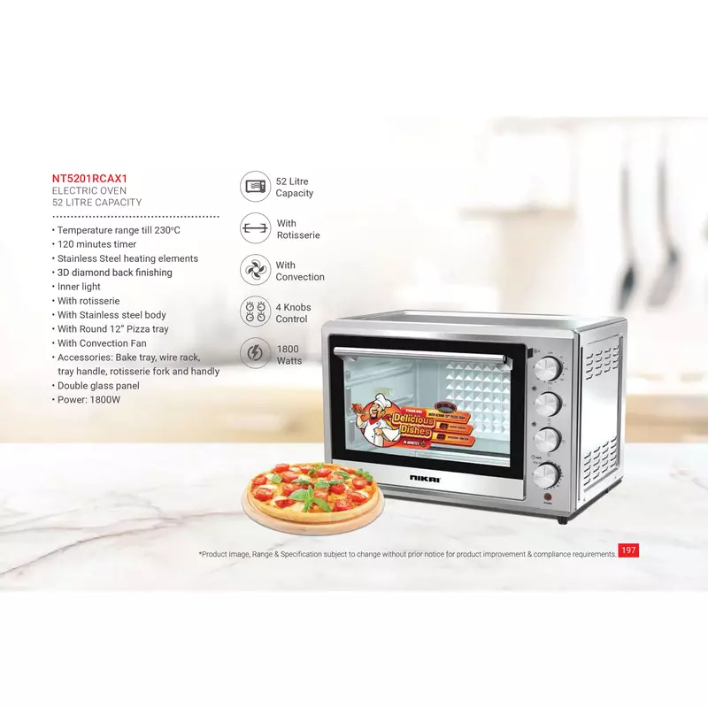 Nikai 52L Electric Oven NT5201RCAX1 is designed for home cooks and culinary enthusiasts who need a versatile, efficient, and precise cooking solution. Featuring a generous 52L capacity and powerful 1800W heating, along with a 120-minute timer, convection fan, and rotisserie function, this model ensures delicious, evenly cooked meals with ease. Upgrade your kitchen today with Azzaman Household.