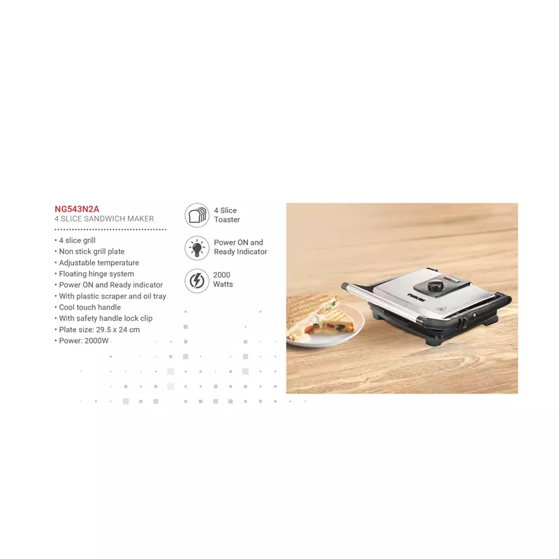 The Nikai 4 Slice Sandwich & Grill Toaster | 2000W is your ultimate kitchen companion for quick, delicious meals. Engineered for versatility and performance, this powerful 2000W appliance effortlessly transforms your favorite ingredients into perfectly grilled sandwiches, crispy paninis, and more. Its generous 29.5 x 24 cm non-stick grill plates accommodate up to four slices at once, making it ideal for family breakfasts or entertaining guests. Experience superior cooking control with adjustable temperature settings and convenient light indicators, ensuring every dish is cooked to perfection. Discover more high-quality kitchen solutions in our Toaster category.