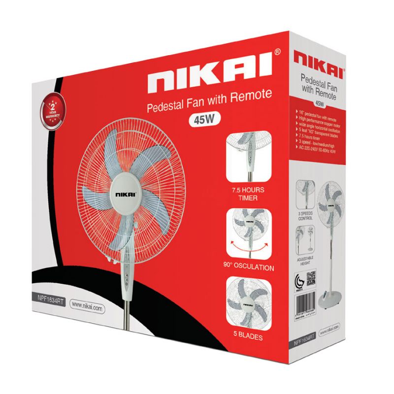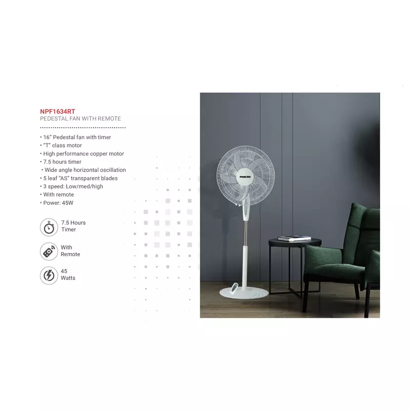 Nikai High Performance Copper Motor 16-inch Pedestal Fan is designed for discerning users who need powerful, quiet, and convenient cooling. Featuring a robust High Performance Copper Motor and a smart 7.5-Hour Timer & Remote Control, this model ensures optimal comfort and energy savings. Upgrade your setup today with Azzaman Household.