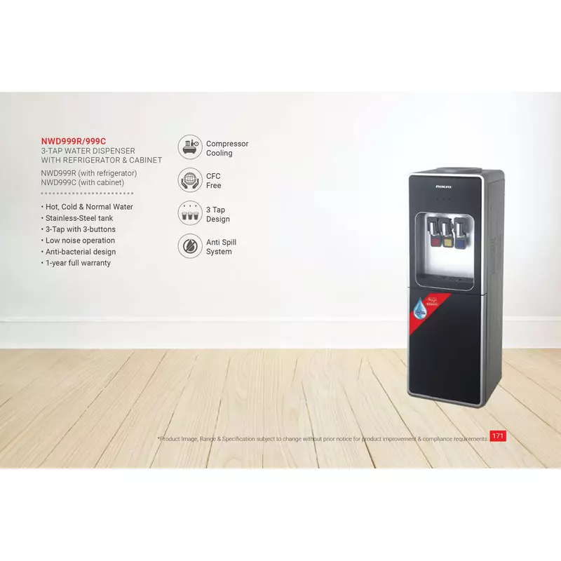 Nikai Water Dispenser NWD999R is designed for homes, offices, and various commercial or public spaces who need instant access to hot, normal, and cold water, plus integrated storage. Featuring three distinct taps and a built-in refrigerator, this model ensures unparalleled convenience and hygiene. Upgrade your setup today with Azzaman Household.