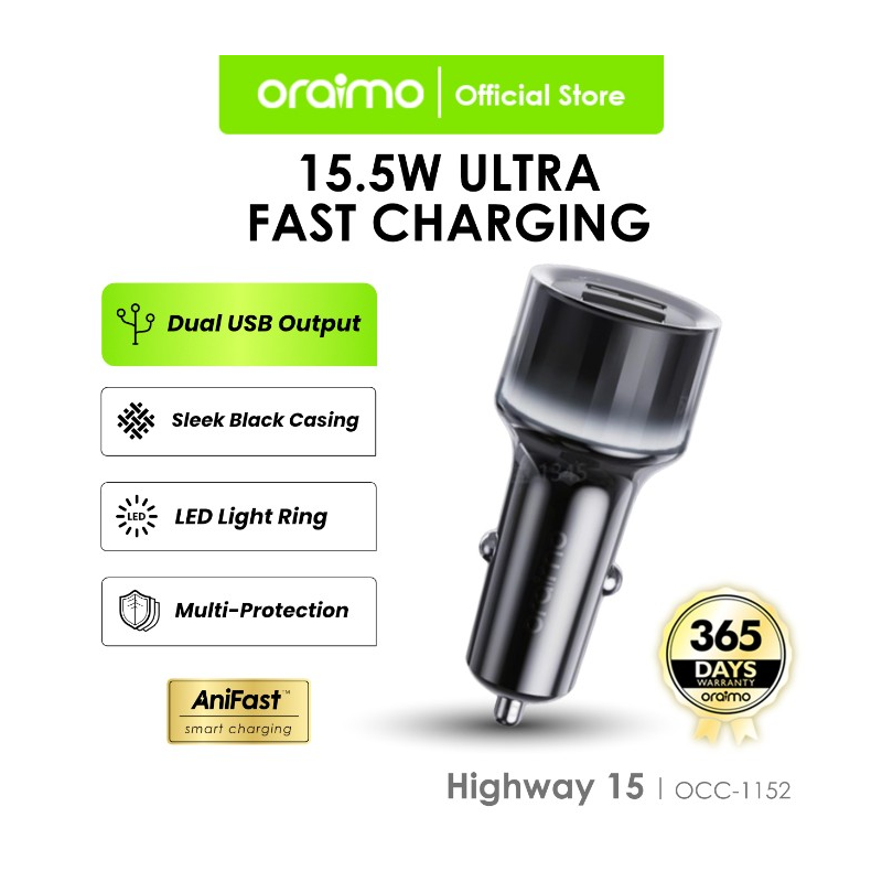 The Oraimo Highway 15 Car Charger OCC-1152D is your ultimate travel companion, engineered to keep your devices charged and ready for action on the go. Boasting a powerful 15.5W total output and dual USB-A ports, it allows you to charge two devices simultaneously, making it perfect for road trips, daily commutes, or quick errands. Its sleek black design, complemented by an elegant LED light ring, seamlessly integrates into any car interior while providing convenience in low-light conditions. Crafted with a multi-protection safety system, this charger ensures optimal safety for both your devices and vehicle. Discover the full range of Oraimo charging solutions and other automotive accessories, including Car Modulator & Charger options, exclusively at Azzaman Household.
