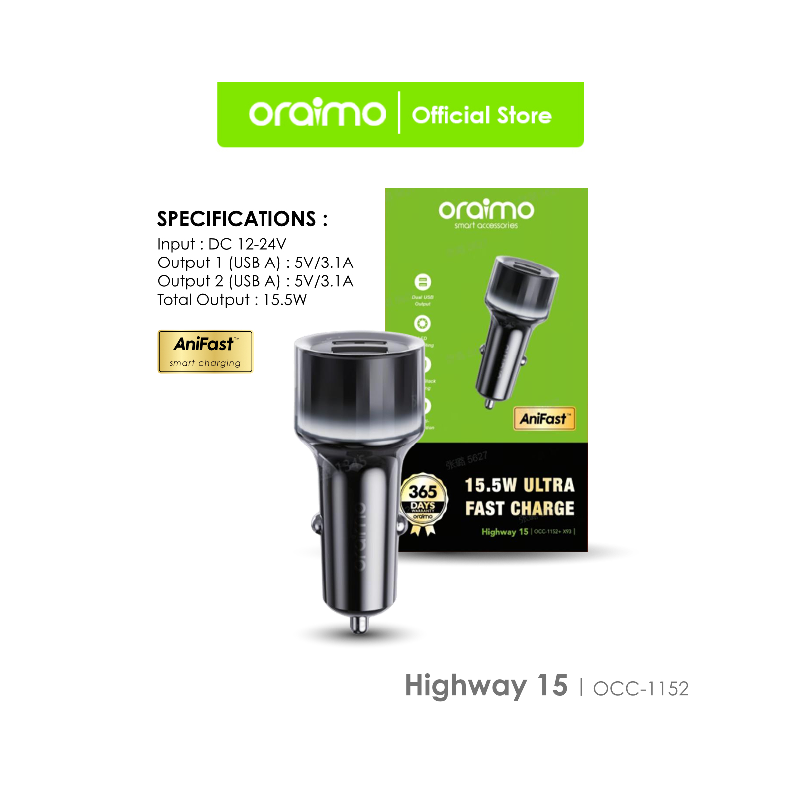 Oraimo Highway 15.5W Dual USB Car Charger | Dual USB Output is designed for drivers and passengers who need efficient and safe on-the-go charging. Featuring dual USB-A outputs and 15.5W total power, this model ensures all your devices remain fully charged and protected throughout your journey. Upgrade your setup today with Azzaman Household.