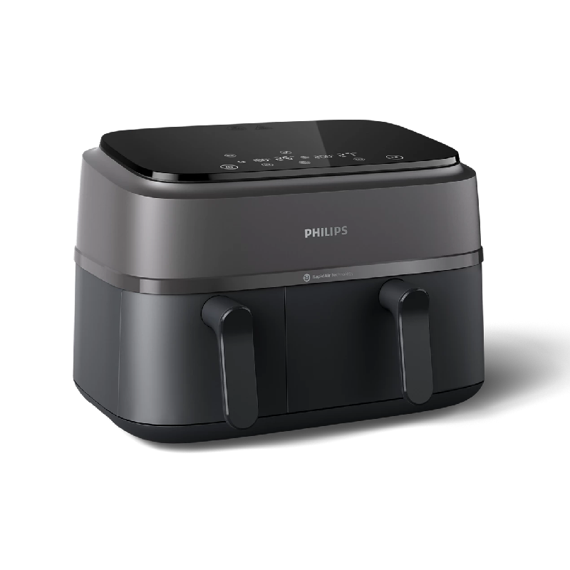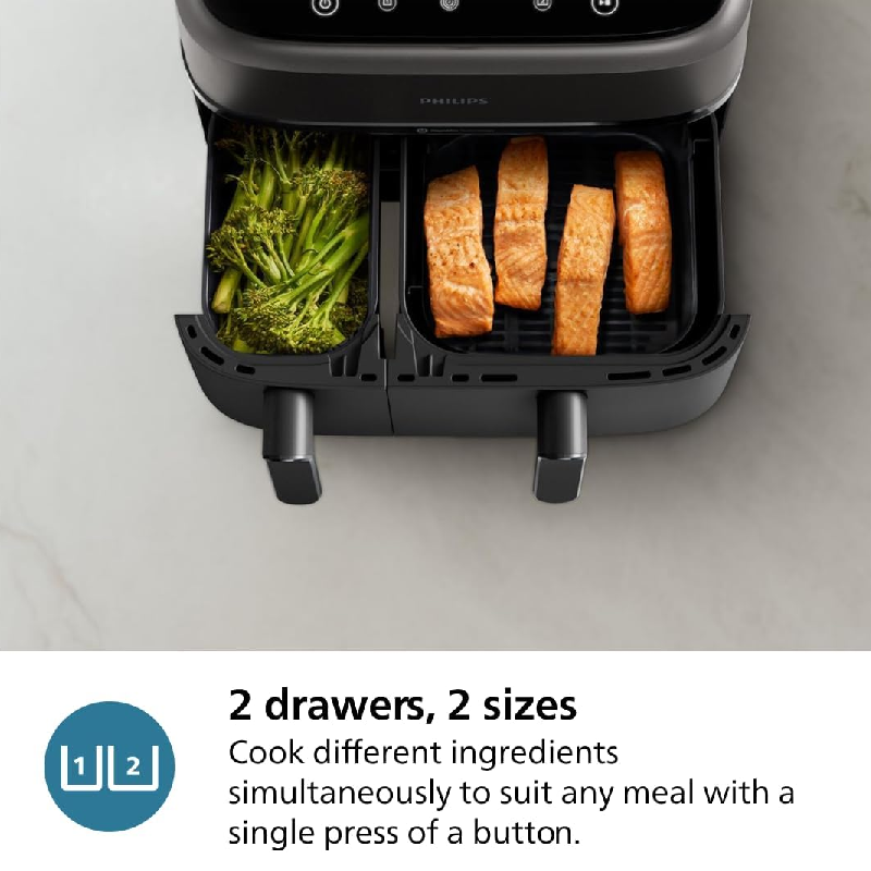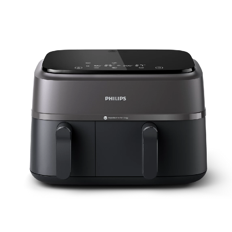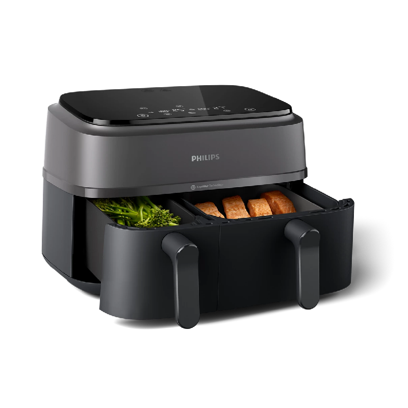 Experience the next level of culinary convenience with the Philips Dual Basket Air Fryer NA350/00, part of the innovative 3000 series. Designed to revolutionize your kitchen, this powerful 2750W Air Fryer allows you to effortlessly prepare two distinct dishes simultaneously, ensuring both are hot and ready at the same time. Powered by advanced Rapid Air Plus Technology and a smart LED display with 8 intuitive presets, it delivers crispy, tender, and evenly cooked meals with up to 90% less fat*. Enjoy the flexibility of its large 9L capacity across two intelligent baskets, perfect for everything from family main courses to individual side dishes, all while saving up to 70% energy compared to a standard oven** and cooking meals faster***.
