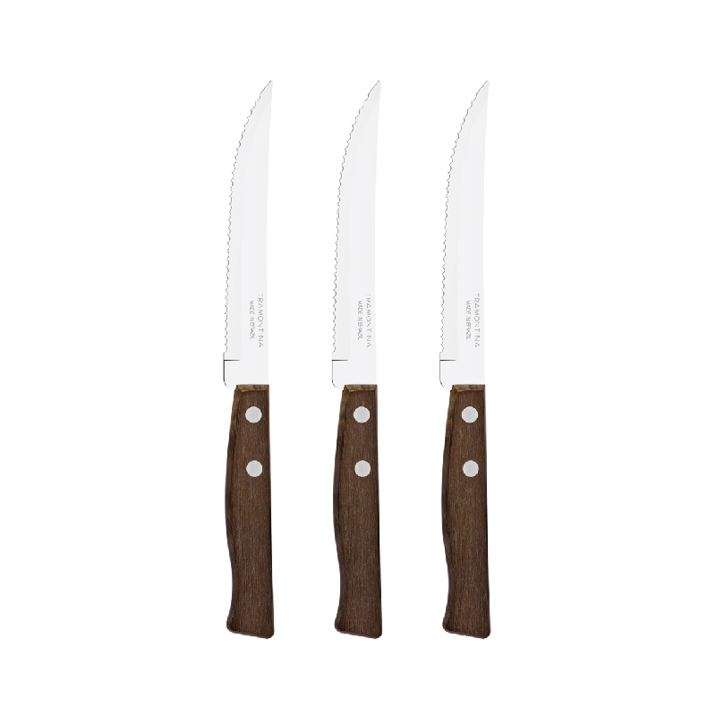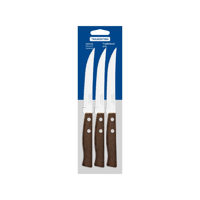 Tramontina Tradicional 5″ Steak Knives Set is designed for discerning hosts and steak enthusiasts who need exceptional dining experiences and reliable cutting performance. Featuring high-quality stainless steel blades and natural wood handles, this model ensures precise cuts and an elegant, rustic touch to every meal. Upgrade your setup today with Azzaman Household.