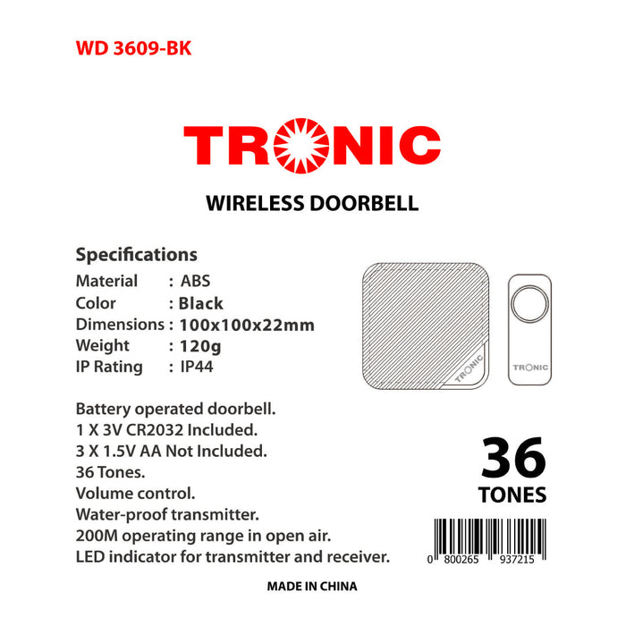 Tronic Wireless Doorbell | 36 Chimes & IP44 Rated is designed for modern homeowners who need a reliable and customizable home entry notification system. Featuring an easy-to-install wireless design with volume control and an IP44 waterproof transmitter, this model ensures convenience and peace of mind. Upgrade your setup today with Azzaman Household.